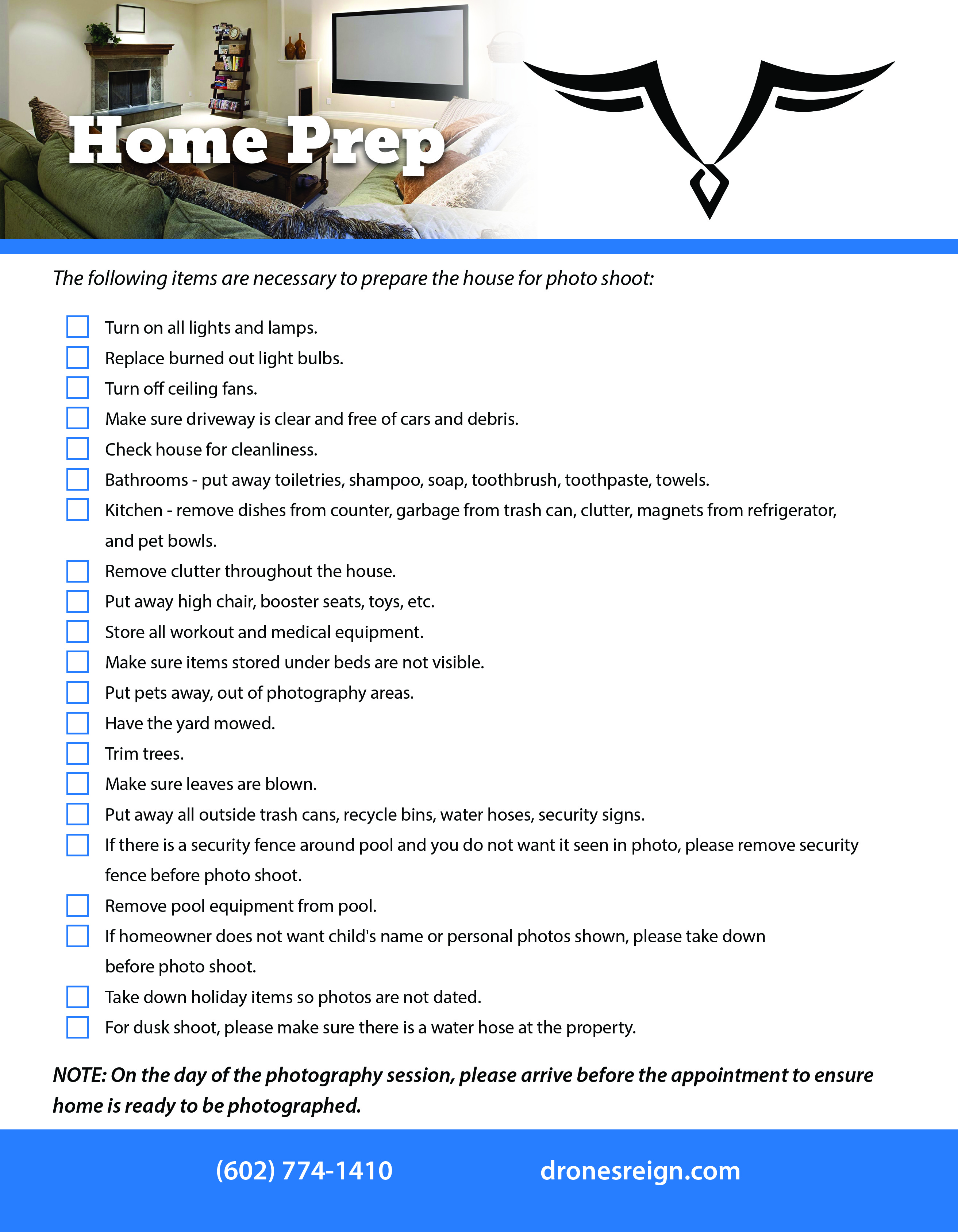 After setting an appointment with Drones Reign, please review the home preparation flyer to ensure your property is ready for the photo shoot. Here you will see all those requirements for photography